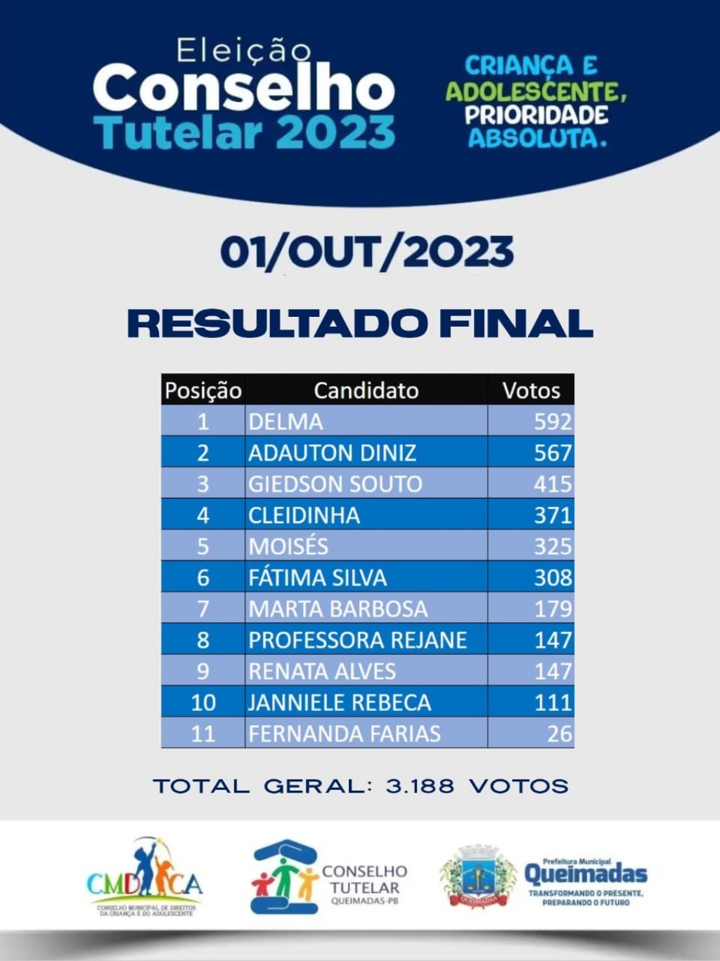 A apuração votos foi realizada na Escola Municipal Antônio Vital do Rêgo, com a presença dos candidatos e seus respectivos fiscais, e da comissão eleitoral do Conselho Municipal dos Direitos da Criança e do Adolescente (CMDC), órgão responsável pela condução de todo o processo de escolha, e do Promotor de Justiça da Comarca de Queimadas Leonardo Furtado.
