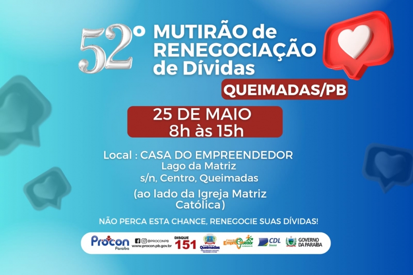 Esta será a primeira vez que a Autarquia de Proteção e Defesa do Consumidor (Procon-PB) realizará o Mutirão de Renegociação de Dívidas na cidade de Queimadas. A parceria foi firmada mediante o contato feito pela gestão municipal, através da Secretaria Municipal de Desenvolvimento Social (SMDS) e da Casa do Empreendedor.