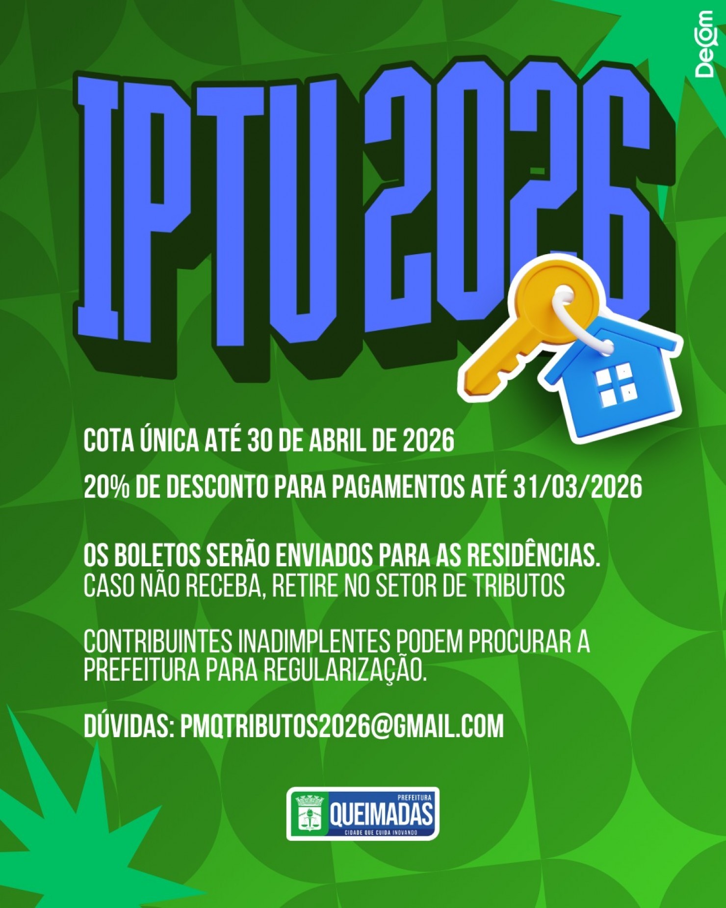 A Prefeitura Municipal de Queimadas-PB divulgou o calendário de recolhimento do Imposto Predial e Territorial Urbano (IPTU) referente ao ano de 2026. Neste ano, os contribuintes terão até o dia 30 de abril para efetuar o pagamento em cota única e os pagamentos realizados até 31.03.2026 terão desconto de 20%.