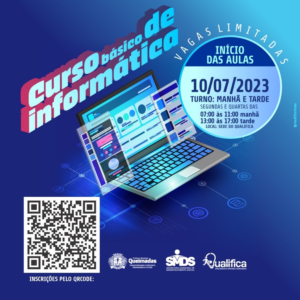 O Serviço Municipal de Capacitação e Desenvolvimento - Qualifica está com inscrições abertas para o curso básico de informática. Podem se inscrever pessoas residentes no município de Queimadas-PB, com idade mínima de 14 anos e com escolaridade a partir do 9º ano do Ensino Fundamental.